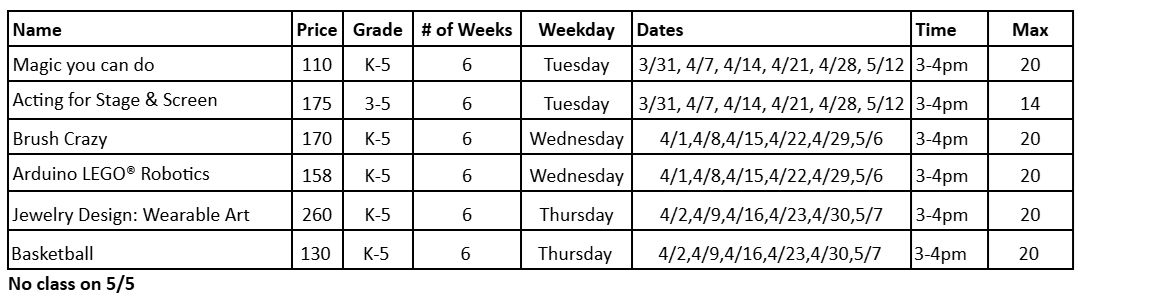 Registration will take place directly with class vendors/instructors and will not be available directly through the PTO website. Registration links will be posted when registration opens. Each class has a maximum number of students listed below. Register ASAP as classes will fill quickly!